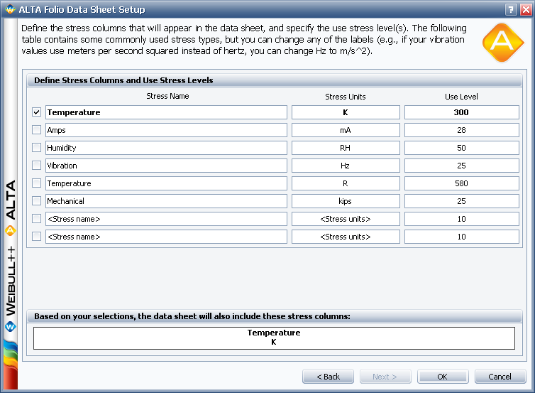 Every stress column represents a stress type. So, for example, a data sheet with two stress columns would be used for data obtained from a two-stress test. In this case, each row would contain a failure/suspension time and the two stress values that define the stress level at which the data point was obtained (e.g., a unit might have failed at 100 hours while tested at 343 K and 80% relative humidity).