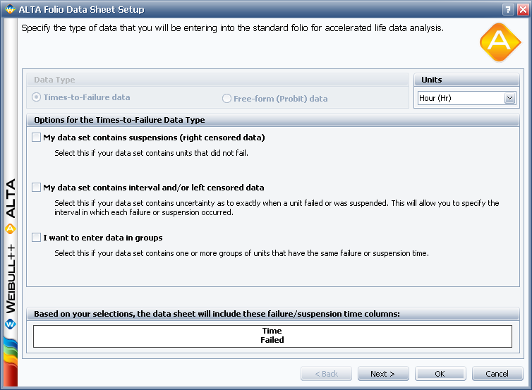 Note: In the Synthesis version, you now have the ability to define the time units used for the data set and calculations. For example, if your data set contains failure times in hours, you now have the option to perform calculations using different time units such as years, months, days, etc. The software performs the unit conversion automatically.
