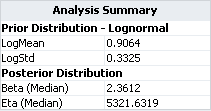 Note that instead of a single calculated value for each of the parameters, the parameters of the Bayesian-Weibull distribution are distributed. This result is known as a posterior distribution. In the example, the result showing that Beta (Median) = 2.3612 means that the median value of the posterior distribution of the beta parameter is 2.3612. For convenience, this is used as the single point estimate for the beta parameter.