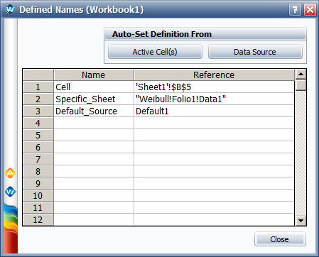 In any of the spreadsheet utilities (i.e., analysis workbooks, general spreadsheets, etc.), you can use the Defined Names window to create variable names that reference specific spreadsheet cells or data sources. These names can then be used in any formula or function within the same workbook or folio. (Note that the following examples are for Weibull++. Similar functionality is available in ALTA, RGA, BlockSim and DOE++.)