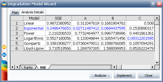 On the Main tab of the Degradation Model wizard, select the models you would like to consider. Click Analyze to start the evaluation. The results of the evaluation will be presented as in the example shown next.
