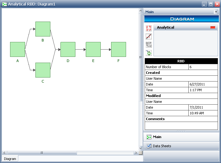 When you analyze a diagram, the software analyzes the relationships of the components and puts the reliability-wise configuration into a mathematical formula. The result of this system analysis is used to obtain reliability calculations and plots. The Equation Viewer displays the mathematical formulation of the system relationships in addition to a legend with the failure distribution for each block in the diagram.