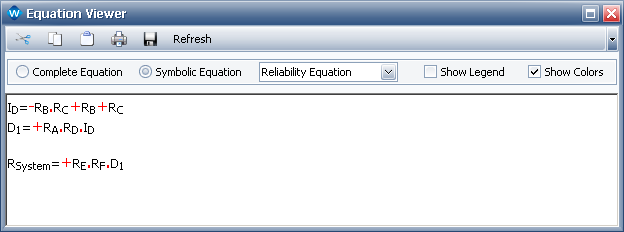 When you use the complete equation view, the software automatically performs all token substitutions. In this view, you can view only the system reliability equation; the pdf equation and the failure rate equation are not available. You should be aware that in some cases, the software may not be able to render the complete equation in the Equation Viewer even though it has internally computed it. This could happen if the memory available on your computer is insufficient and is therefore unable to construct the equation algebraically. This usually does not happen unless there are over one million terms.