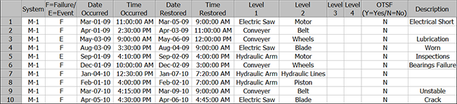 Levels 1, 2, 3 and 4 indicate the subsystem or component that was responsible for the event. This gives you the flexibility to analyze the failure and repair data by certain levels within the system. For example, in row 1 of the sample data sheet, the failure event was caused by the motor of the electric saw of machine M-1. By entering this level of information in the data sheet, you will have the option to obtain individual failure and repair distributions for the motor (2nd level) and the electric saw (1st level). Note that in order to perform an analysis, you must at least specify a 1st level component for every entry in the log.
