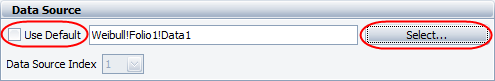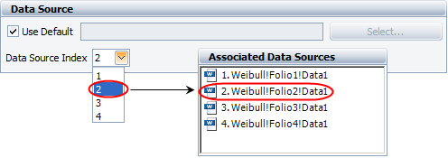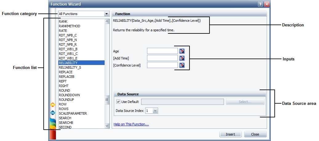 When you are creating a function that obtains data or results from an existing analysis in Weibull++, ALTA, RGA or BlockSim, there are two ways to specify the data source. Both options are available in analysis workbooks. The data source name option is used with general spreadsheets and the data source index option is used with Word reports. (This is not applicable for the Function Wizard in DOE++.)