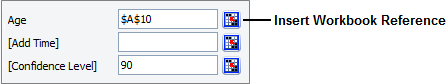 When you are working in an analysis workbook, you can use cell references as inputs, if desired. For example, instead of entering 1000 for a time input, you could specify to use whatever time is currently entered into cell A10, using either the relative reference (A10) or the absolute reference ($A$10). (See Cell References.)