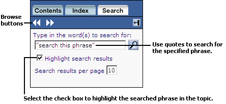 The Search tab allows you to perform a full-text search of all help file topics to locate the text that you specify. Type the word(s) you are searching for in the box at the top of the panel and press ENTER. (Note that you can enclose a phrase in quotes to search for that exact phrase, and you can use the Boolean operators AND and OR to help narrow the search.) Click the Highlight search results check box to highlight the searched phrase in the topic.