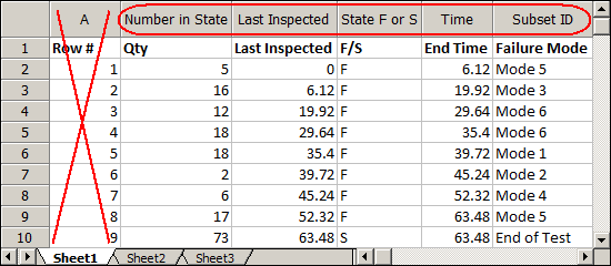 As an example, the following picture shows data that will be imported into a Weibull++ standard folio. Column A will not be imported. The rest of the data has been assigned to columns that are used in the standard folios.
