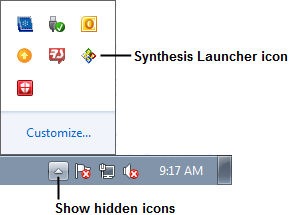 Make sure the Synthesis Launcher is not currently running. To check this, click Show hidden icons in the Windows notification area (i.e., the "system tray" located next to the clock in the Windows taskbar) and look to see if the Synthesis Launcher icon appears. If it does, click the icon and choose Exit Synthesis Launcher.