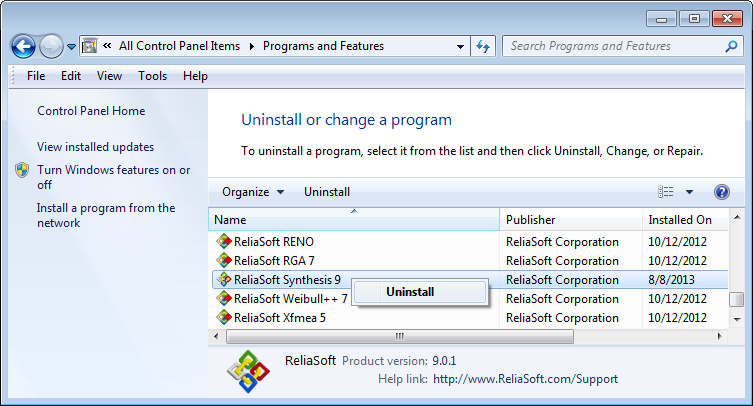 In the Uninstall or change a program window, double-click ReliaSoft Synthesis 9 and follow the prompts.