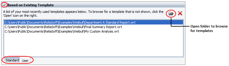 The Standard tab displays the templates that are installed with the software and stored in the applicable sub-folder under Documents\ReliaSoft\Templates.