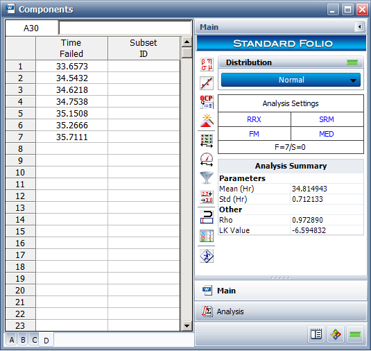 The first step in this analysis is to model the dimensions of each of the parts using the recorded data. To do this, create a Weibull++ standard folio configured for times-to-failure. Name this folio “Components.” Then enter the dimension measurements into the new folio with a separate data sheet for each component. Next, analyze each data set assuming a normal distribution and RRX as the analysis method. Below is the “Components” folio with the analysis results for component D displayed.