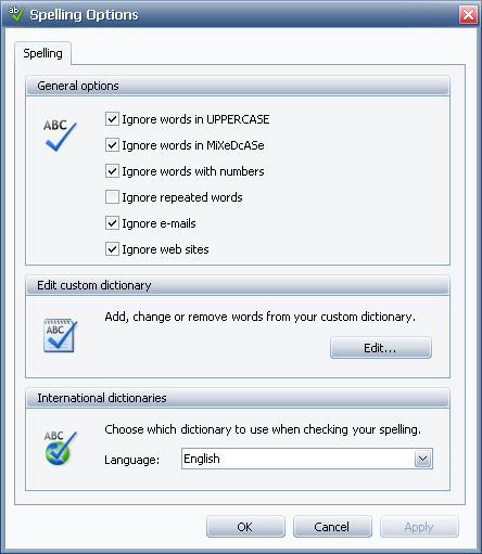 International dictionaries allows you to choose the language of the dictionary that the spell checker will use.