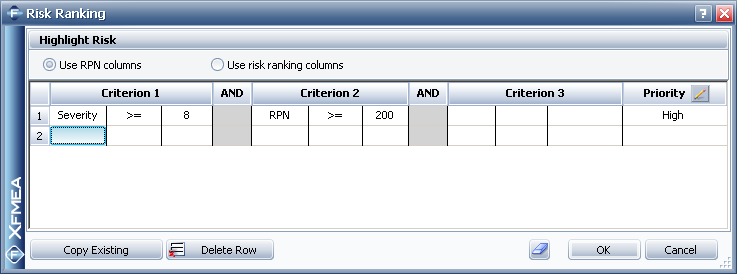Xfmea also allows you to define a more complex logic for the priority highlights functionality. To use this feature, choose Risk Ranking from the drop-down list and then click the Risk Ranking Logic button to open a window like the one shown next.