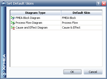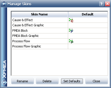 You can select a skin in this window and rename or delete it. In addition, you can click the Set Defaults button to specify skins that will be used as the default settings for new FMEA Block diagrams, process flow diagrams and cause and effect diagrams.