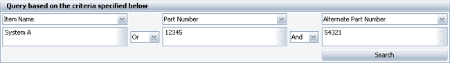 OR searches for the items that match either the first or second keyword/phrase requirement. For example, if you select Item Name and enter "System A" in the first input box and then select Part Number and enter "12345" in the second input box, the utility will search only for the items with either "System A" anywhere in the Item Name field, "12345" anywhere in the Part Number field, or both.