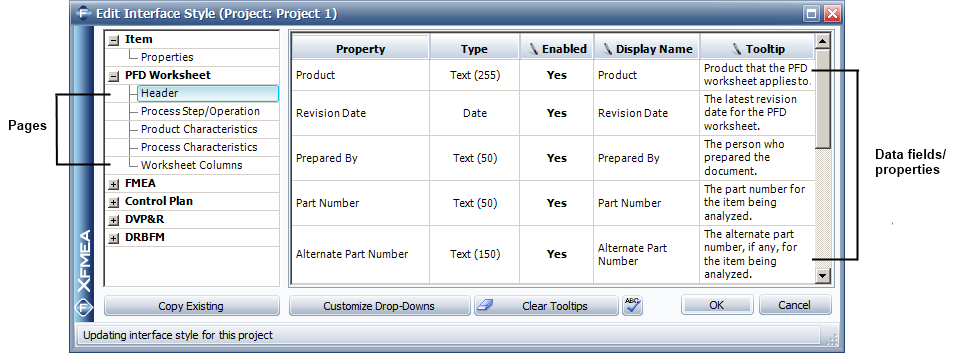 Five pages in the interface style display a list of the properties that have been enabled for a particular type of analysis (FMEA, PFD worksheet, Control Plan, DVP&R or DRBFM) and allow you to set the order in which they will be displayed in the analysis worksheet.