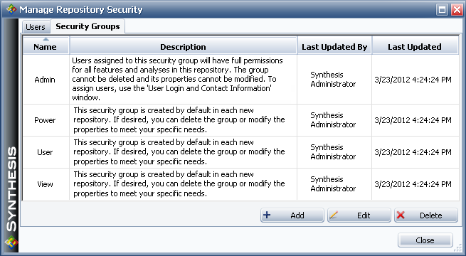 Both security methods use security groups to determine the permissions that users will have within projects. A security group is a set of permissions that can be granted to user accounts, with permissions ranging from read-only access to full administrative authority. Users with the “Manage users and logins” permission can use the Manage Repository Security window to set up security groups and users.