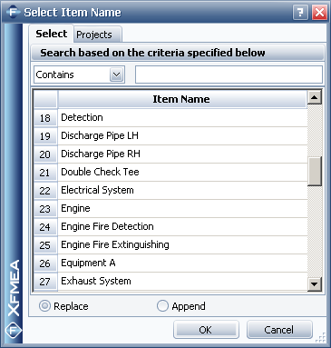 The Select Existing feature is available for most of the text fields within Xfmea. This utility provides a list of existing descriptions from specified data sources that might apply to the current data field. Each list can be sorted automatically and/or filtered to match specific search criteria. For example, the utility can provide a list of causes that contain the word "fatigue."