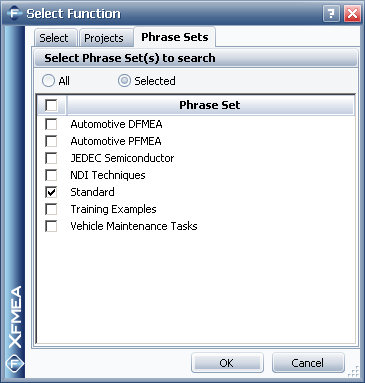For FMEA records only, to select the phrase set sources for the descriptions that will be displayed in the Select Existing window, click the Phrase Sets tab. Each time you open a Select Existing window, it will use the same phrase sets that were selected the last time you used the utility.