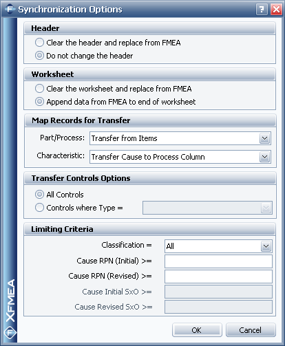 In the Worksheet area, select whether to replace all of the information in the Worksheet tab of the control plan with data from the associated FMEA or append the FMEA data to the end of the existing data in the worksheet.