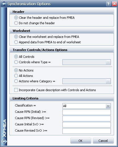You can choose DVP&R > Synch > Sync with FMEA to update the DVP&R with new data transferred from the FMEA. The Synchronization Options window will appear, as shown next.