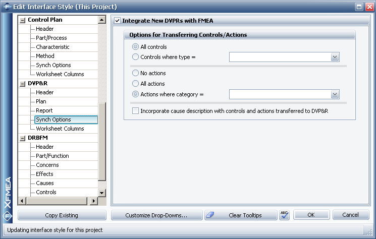 The following options are available on the DVP&R > Sync Options page of the interface style when you select the Integrate New DVP&Rs with FMEA check box, as shown next.