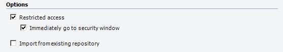 Note: You cannot automatically remove security from a database once it has been enabled. However, you can create a new non-secure database and use the Import from existing repository check box to automatically import all of the data from the secure database to the non-secure one.