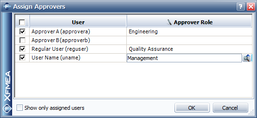 The electronic approval tracking feature allows an authorized user to specify one or more users as assigned approvers of a version of the analysis. In order to be listed as an assigned approver, the user must have Xfmea installed, a valid user account in Xfmea (i.e., a license to use the software) and access to the database and project.