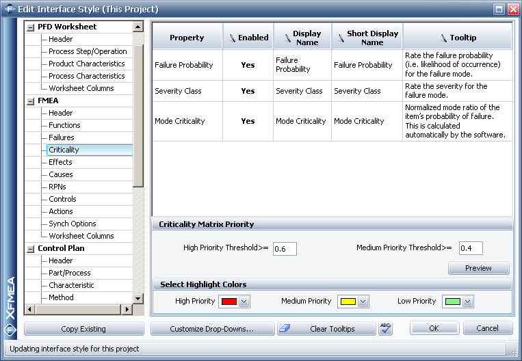 You can make most of these selections on the FMEA > Criticality page of the interface style.