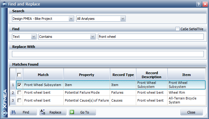 Note: For options in drop-down lists (e.g., the Action Category list) or for options in rating scales (e.g., the Initial Severity for effects) you can search for and replace records in the current project only. For example, this capability might be used if you have created a process FMEA with data transferred from an existing design FMEA and you need to update all of the analysis data in the project to match the new settings. In this case, in the design FMEA's Action Category drop-down list, the actions that were assigned to the "Design" group will be handled in the process FMEA by the "Manufacturing" group. To do so, you can use the Find and Replace window to search for all records that have been assigned to the old category (e.g., "Design") and replace with the new category (e.g., "Manufacturing").