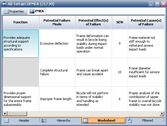 To view the FMEA in a tabular format, click the Worksheet tab at the bottom of the Analysis panel.