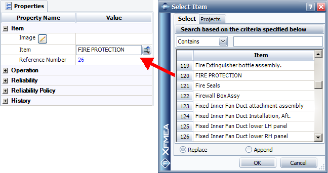 The following picture shows an example of how a Select Existing window may be used in Xfmea to populate a text field. The list in the example is generated automatically from text that has been entered in the Item field for other projects within the database.