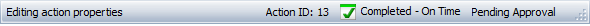 The action’s status bar displays two complementary status indicators. The first one is based on the actual and expected start date and completion date. It indicates that the action is not started, in progress or complete and whether it is on time or running late. (See Action Timeline and Status.)