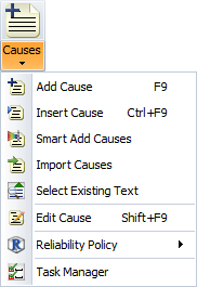 To access the commands to add or edit cause records, right-click inside the FMEA hierarchy or worksheet, or use the FMEA tab of the ribbon. (See FMEA Tab for a complete list.)