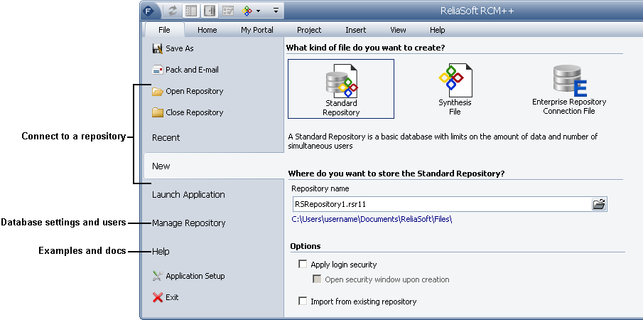 Use commands on the File menu (New, Recent or Open Repository) to create or open a Synthesis repository (database). (See Database Types.)