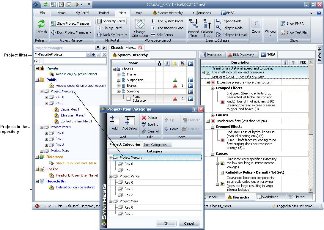 | Tour Intro - Repositories & Projects - Project Properties - Using FMEAs - Using RCMs - More Analyses & Tools |