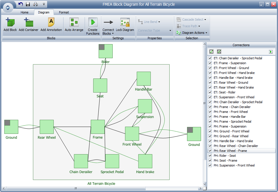 You can add blocks to the diagram so that you can add connections that need to be considered in the FMEA. For example, in the image shown below, the "Ground" and "Rider" blocks are not included in the system hierarchy, but were added to the diagram so that their interfaces could be included. The indicator in the top left corner of the block indicates that this is an "Additional Item."