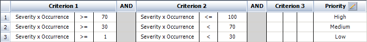 If you choose to use the Item Risk, you must also define the risk ranking logic on the FMEA > RPNs page. The following picture shows a simple example with three priority levels; you can configure the priorities to meet your needs, and set the criteria based on Severity, Occurrence or SxO. (See Risk Ranking Logic.)