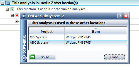 Linked FMEA: Links to the exact same functions, failures, etc. that are associated with another item. A change in the source analysis will be reflected in all locations where it is linked. To be eligible for linking, an FMEA must be a) associated with another item in the current project or in a reference project and b) not already linked from the current item.
