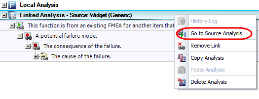 To view/edit the source analysis for a linked FMEA, right-click the FMEA tab or the Linked Analysis heading and choose Go to Source Analysis.
