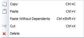 The cut/copy/paste commands are available when you select the record(s) in the FMEA and choose Home > Clipboard > [Cut, Copy, Paste, Paste Without Dependents], and when you right-click the record(s).