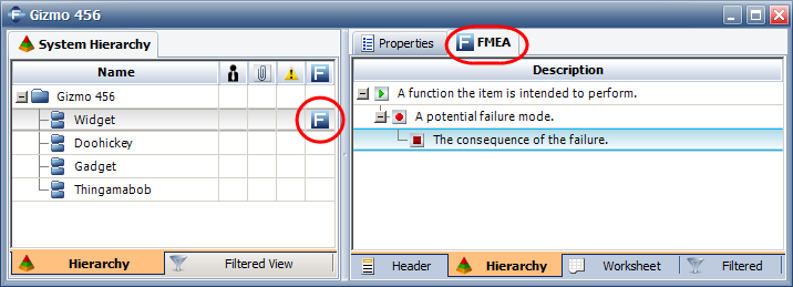 For more information about using the four FMEA tabs at the bottom of the Analysis panel, see FMEA Header, FMEA Hierarchy, FMEA Worksheet and FMEA Filtered View. For information about working with the functions, failures, etc., see FMEA Records.