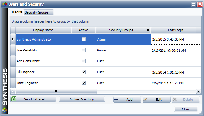 The Users tab of the Users and Security window offers the same filter, column configuration and grouping tools that are built in to other Synthesis utilities that use a similar grid (e.g., the Synthesis Explorer, Actions Explorer, etc.). For details about how to use each feature, see: