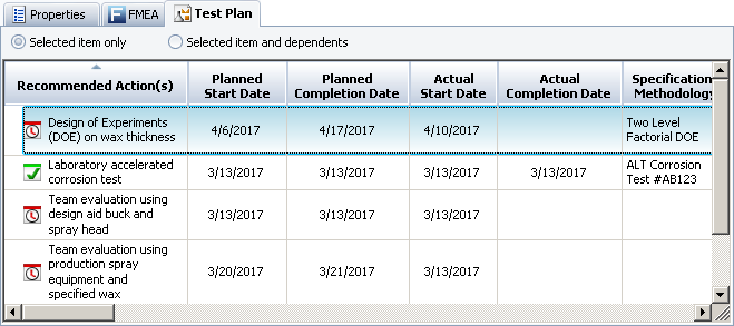 The Test Plan tab in the Analysis panel displays a list of actions that describe specific tests that need to be performed. The list is created on-the-fly based on actions and/or controls in the FMEA.