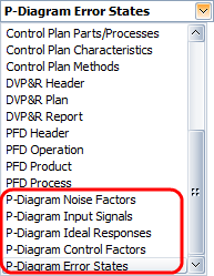 If you have the text elements in an Excel file, you can right-click the P-Diagram analysis tab in the Analysis panel and choose Import from Excel.