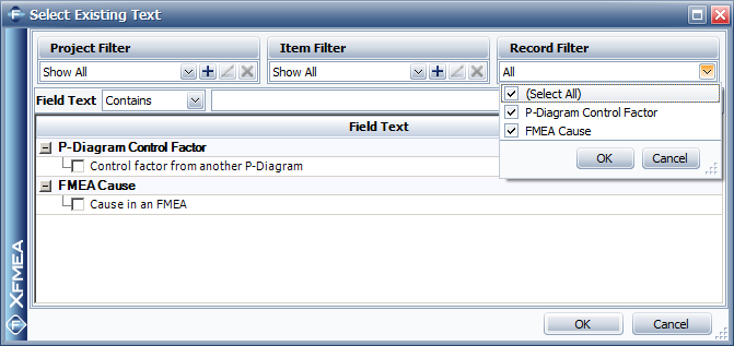 In both cases you can use the filters at the top of the window to specify which descriptions are displayed. The following example shows the options for creating new rows in the Control Factors input box. For this type of input, you can select control factors from existing P-Diagrams or causes from existing FMEAs.