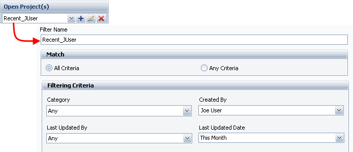 For example, with the filter shown below, the current project explorer will show only items created by Joe User and updated within the current month.