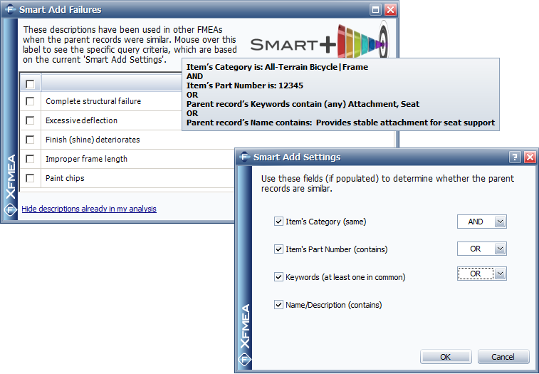 The Smart Add utilities make it easy to quickly find and copy item names or FMEA descriptions from other similar analyses.