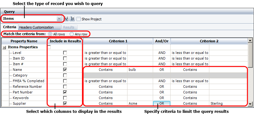 First use the drop-down list at the top of the panel to choose which type of record you wish to query (items, FMEA causes, etc.). This will update the Criteria tab to display the relevant properties for the selected record type. Then specify whether the query results will match the conditions from All rows in which criteria are specified (i.e., AND) or from Any row in which a criterion is specified (i.e., OR).